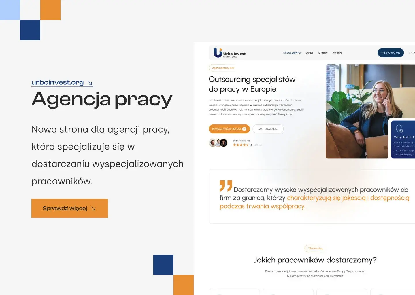 UrboInvest od wielu lat dostarcza specjalistów do pracy w Europie. Produkcja, budownictwo, transport, energetyka odnawialna - rocznie obsługują kilkadziesiąt firm, które potrzebują konkretnych ludzi do konkretnej roboty.