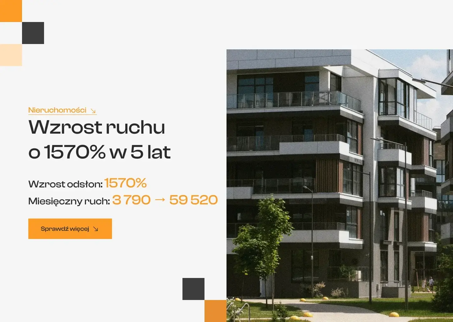 Pięć lat to wystarczająco dużo czasu, by zobaczyć prawdziwą moc SEO. Nasz klient z branży nieruchomości zaczynał z 3790 wizytami miesięcznie. Dziś? Ponad 59 500.